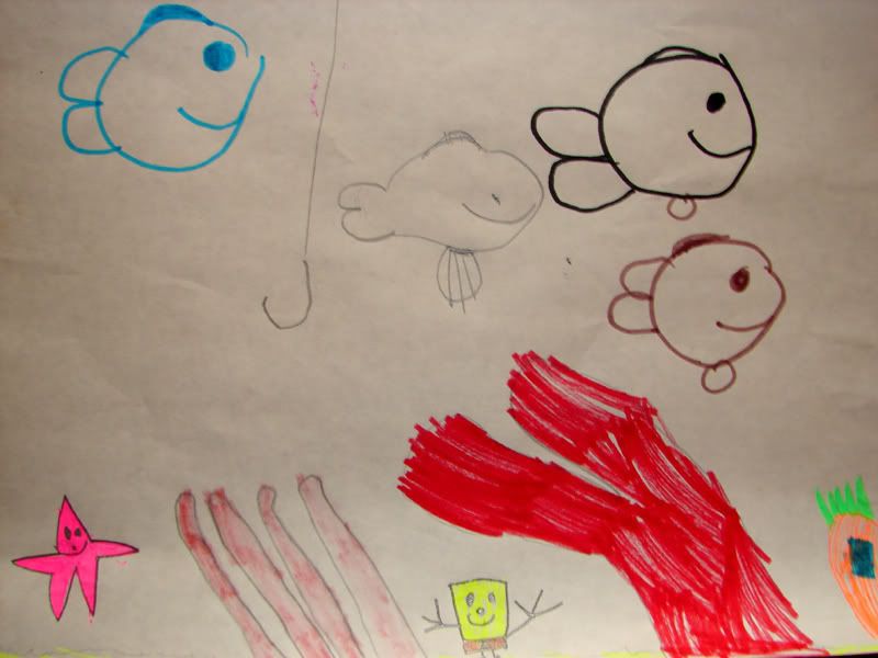 "This is Spongebob and Patrick. There's a hook because someone is trying to catch Patrick, but they're not going to get him. That's Spongebob's pineapple house in the corner."________________________________